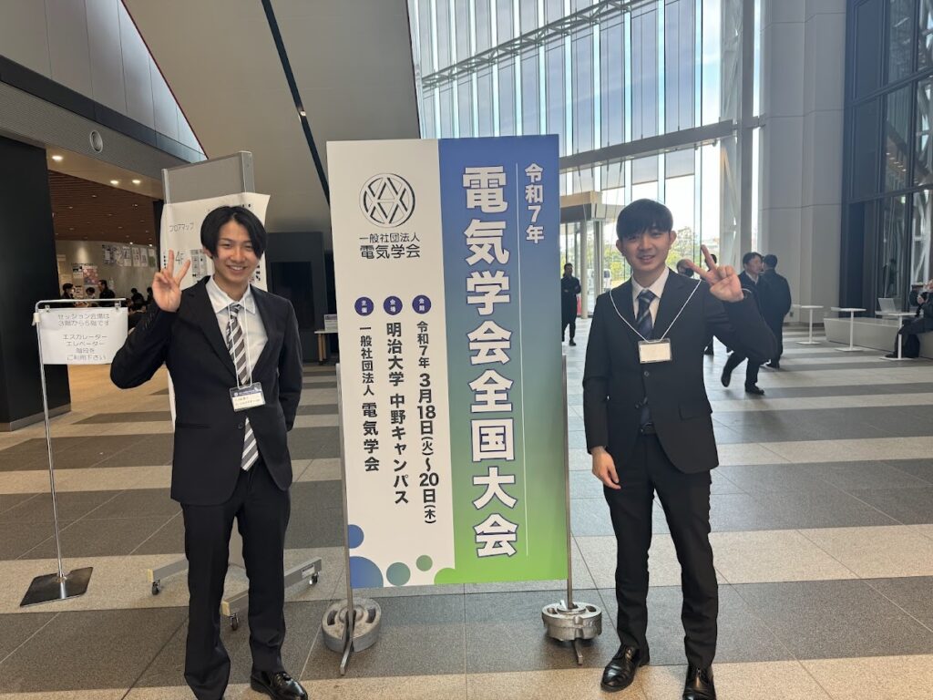 2025年3月18日~20日 M1の関口さん,B4の片岡さんが中野で開催された令和7年電気学会全国大会で発表を行いました 3月 31, 2025 最終更新日時 : 9月 26, 2025 管理者 M1の関口さん,B4の片岡さんが明治大学中野キャンパスで開催された令和7年電気学会全国大会で発表を行いました. お二人とも堂々とした発表,質疑応答でした. お二人とも,お疲れさまでした!